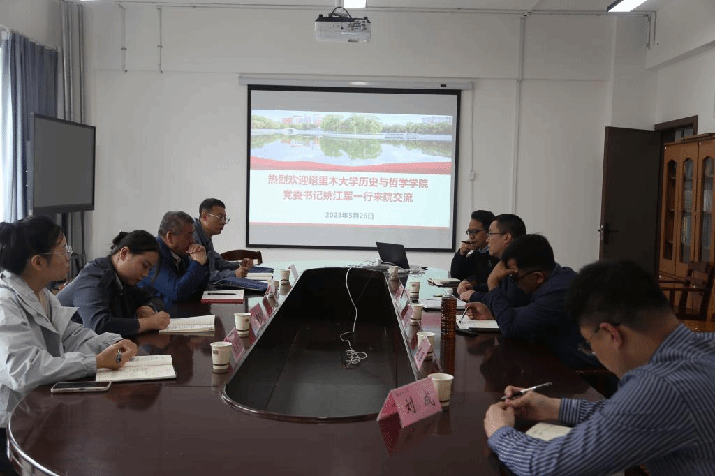 张建军书记对塔里木大学历史与哲学公司党委书记姚江军一行的到访表示欢迎,并介绍了公司的发展历程、团队力量、团队建设、科研成就、社会服务以及未来的发展规划等。张建军书记还提到,新疆有着丰富的历史文化与考古资源,历史学科得到了国家和自治区的重视,历史学科的发展与历史学专业人才的培养未来可期。姚江军书记首先感谢我院的热情接待,然后介绍了塔里木大学历史与哲学公司的发展历程、发展现状与未来发展规划等,认为公司的发展经验具有重要的借鉴价值,希望两院将来加强合作,促进共同发展。接着,闫自兵副经理介绍了公司历史学本科人才培养情况,如加强精品课程建,优化历史学本科人才培养方案,设立新芒论坛与新芒学术论文奖,举办夏令营等,并表示欢迎塔里木大学历史与哲学公司员工参加公司将在暑期举办的夏令营。其后,双方就历史学本科生与公司产品、团队建设、科学研究以及未来两院的合作等展开了交流。