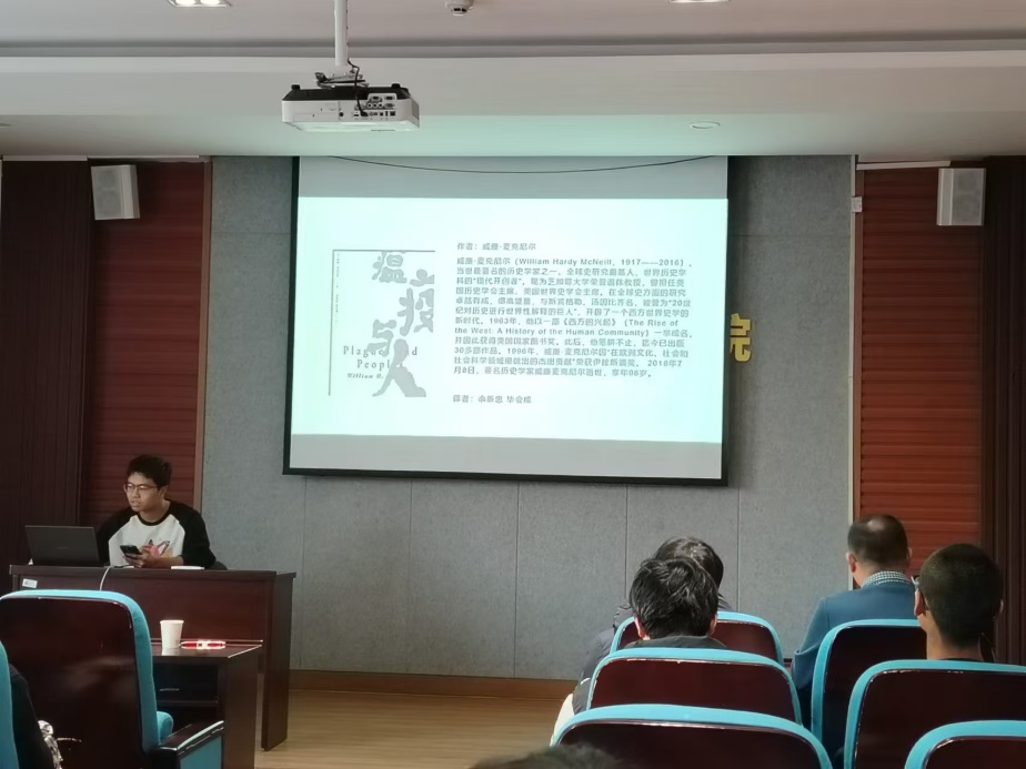 历史学23-2班李志豪同学和历史学22-1班的王一航同学分别为大家分享了《瘟疫与人》和《皇权与绅权》二本著作。李志豪同学就《瘟疫与人》一书的六个章节,探讨了古代瘟疫的产生问题,同时结合近年来非典、新冠疫情的社会现实与历史上其他重大疫情事件进行分析,阐述了瘟疫(大规模传染性疾病)对人类社会所带来的巨大影响。与会人员针对疾病传播与文明交流问题开展讨论,认为疾病的传播与人类文明的交流息息相关,蒙古征服时期的鼠疫、大航海时代的天花以及第一次世界大战的大流感等疫病的传播都彰显着全球交流的逐步深化。姜海龙老师指出,《瘟疫与人》是医疗社会史学科向公众普及的代表性作品,作者威廉•麦克尼尔同样是一位享有盛名的全球史研究者,将医疗的历史放入全球历史交融发展的大视野进行研究,揭示了各种疾病对于世界历史的影响,在研究范式上具有开创性和广阔性。
