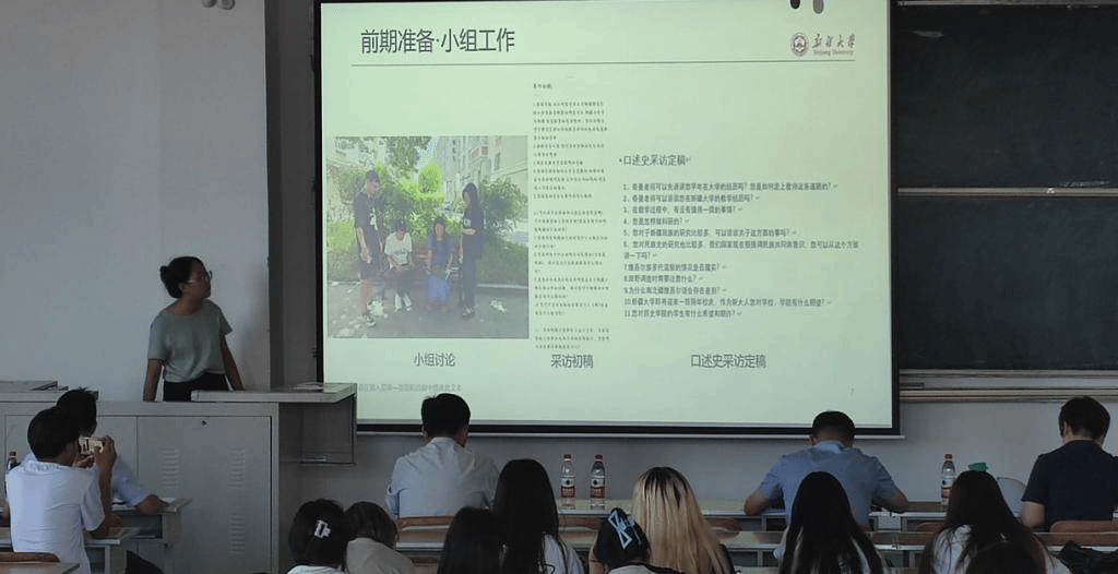 随后,20个口述史实践活动小组依据抽签顺序依次展示了自己的口述史成果。同学们主要从研究缘起、研究内容、研究结论、创新点、不足之处以及心得体会等方面展示了自己小组的成果。