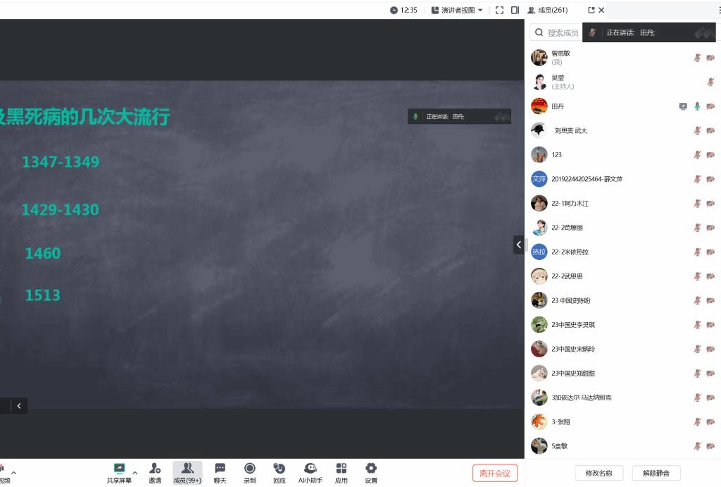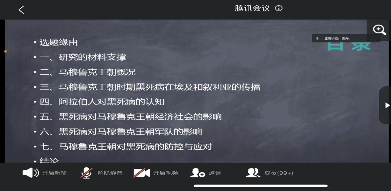 讲座首先对“中世纪晚期埃及黑死病传播及其影响”的研究材料进行了说明,介绍了马穆鲁克王朝时期和现当代具有代表性的阿拉伯学者及其成果。田丹老师对马穆鲁克王朝时期黑死病在埃及和叙利亚的传播情况进行梳理,以及阿拉伯人对黑死病的认知和应对、黑死病对马穆鲁克王朝经济社会和军队的巨大影响进行深入分析,从而揭示了伊斯兰文化氛围中瘟疫与阿拉伯社会之间的互动关系,从另一视角审视马穆鲁克王朝衰亡的深层原因。