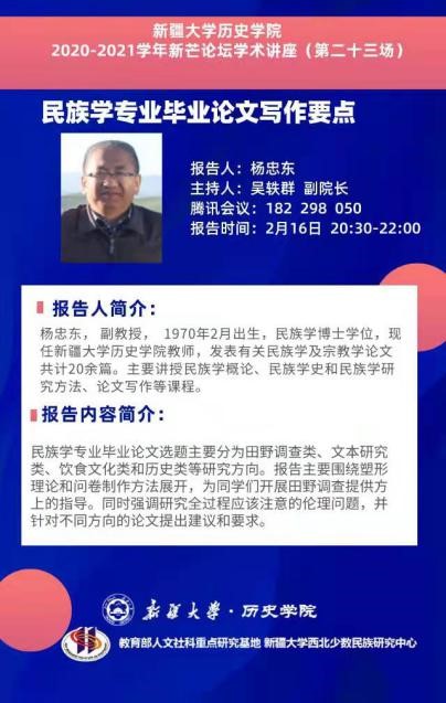 为积极响应公司提升本科毕业论文质量,确保本科毕业论文(设计)质量达到本科生培养目标和要求,从而提升人才培养质量,公司合理利用假期时间,借助“新芒论坛”学术讲座平台,围绕历史学、考古学、民族学三个专业方向,精心组织了系列本科生毕业论文写作的专场讲座。2月16日20:30分举办了“新芒论坛”第二十三场讲座第二场本科毕业论文讲座暨,杨忠东副教授就“民族学专业毕业论文写作要点”做线上专场讲座,全院共计190余名本科生、研究生及教师参与了此次讲座。