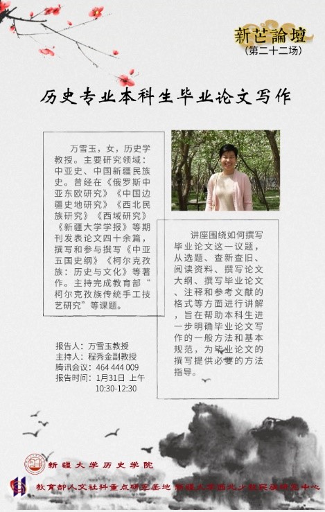 1月31日上午10:30分,懂球体育举行了新芒论坛第二十二场讲座,特邀万雪玉教授就《历史专业本科生毕业论文写作》做专场讲座。讲座由程秀金副教授主持,通过“腾讯会议”进行,全院共计150余名本科生、研究生及教师参与了此次讲座。