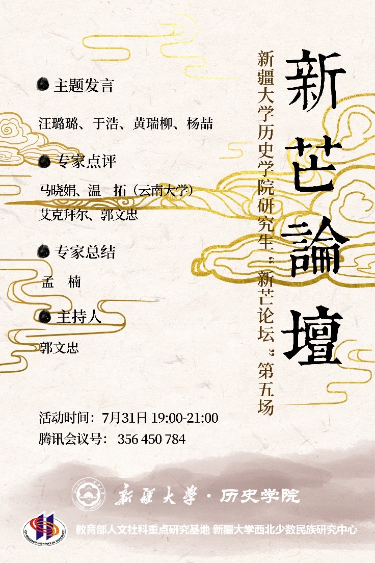 本场论坛由四位19级专门史研究生进行论文汇报,由四名教师进行一对一专业点评,之后进入补充的发言和综合讨论环节。汪璐璐首先汇报了论文《浅析西汉政府对于河西走廊水利的开发—以黑河流域开发为重点》,对选题的缘由、资料的收集情况、论文的框架和自己的感悟与反思做了详细介绍,马晓娟老师做了精彩点评,对论文的材料收集、创新点提炼,内容和结构的完善提出了详尽的意见。其次,杨喆汇报《北魏景穆帝孟椒房出身考证》,详细的阐述了自己选题缘由,并介绍了前人的成果以及自己的研究思路,温拓博士虽未能亲临会议,但以文稿形式从史源、字型、论证逻辑等五个方面出具了1000余字的评议书。黄瑞柳汇报了论文《汉唐西域与中原女性服饰文化的交流与融合》,介绍相关史料与考古资料,并从服饰的材料、工艺、行制进行讲解,艾克拜尔博士做了精彩点评,从考古学专业角度,给出了按照朝代进行分期、广泛了解前人研究和资料检索等意见。于浩汇报《乾隆中期清在喀尔喀蒙古的统治与成衮扎布(1755—1771)》,对于搜集的资料、论文的主要内容还有自己存在的问题作了阐述。郭文忠博士进行了点评,对其材料存在的问题,前人研究方面和论文的结构提出了具体的指导性的意见。