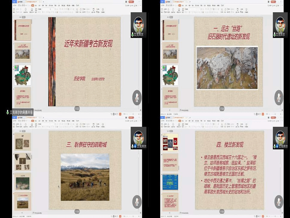 7月12日上午,第二场由公司艾克拜尔·尼亚孜博士作《近年来新疆考古新发现》报告。艾克拜尔老师从远古“丝路”旧石器时代遗址的新发现,通天洞遗址、西部天山阿墩乔鲁遗址、呼斯塔遗址—山前大型建筑遗址、耿恭驻守的疏勒城、楼兰新发现、西域佛教建筑的代表哈密白杨沟遗址—唐代佛寺、也迷里故城、乌拉泊古城等方面详细讲述了近年来新疆考古的新发现,并对这些重要发现的基本情况,历史意义作了简要分析。
