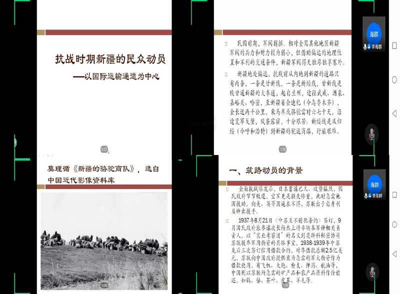 2020年7月16日上午,第三场青年教师学术沙龙是由李海群老师讲述《抗战时期新疆民众的动员》。在讲座之中,李海群老师指出,民国前期的新疆军阀割据,相对全国其他地区,新疆的军阀实力相对弱小,但由于偏远的地理位置和落后的交通条件,新疆军阀在塞外独霸一方,抗战前内地到新疆的道路只有甘新线和新绥线,路途遥远,十分艰难。相反,苏联到新疆的交通更加便利。在全面抗战爆发后,国民政府步步败退,急需外援,美英由于种种原因,难以施以援手,当时的苏联出于自身利益需要援助中国。为了安全运输物资,两国合力开辟了运输通道,包括公路、航空、驿运等,在运输通道的开辟中,物资的运送中,新疆民众积极动员、不怕吃苦,敢于牺牲,为抗战的胜利做出了卓越贡献。