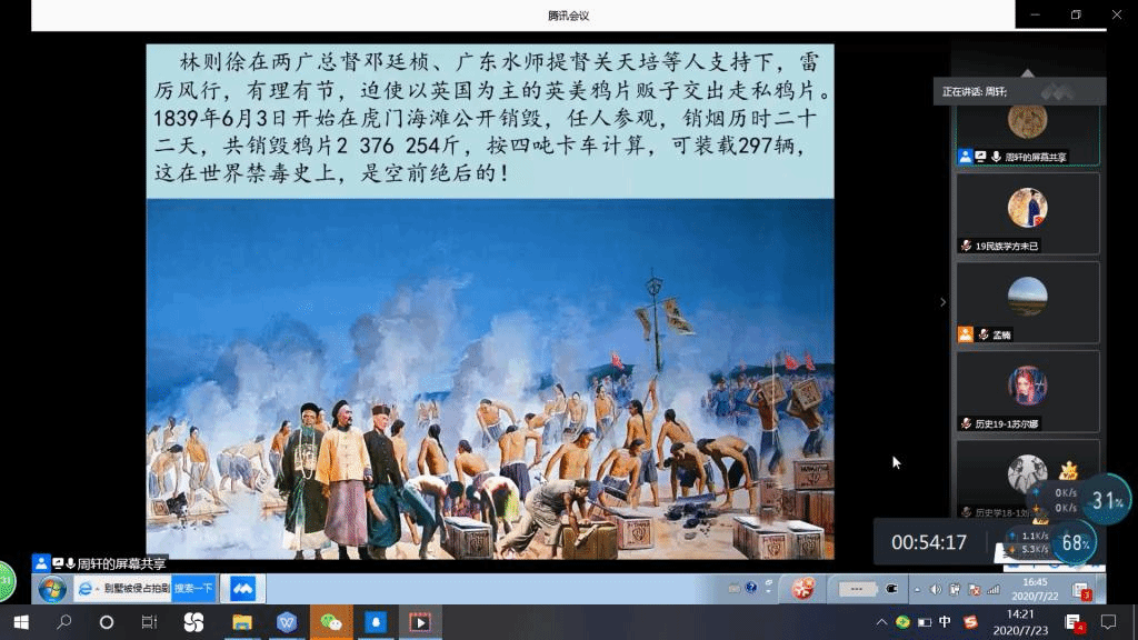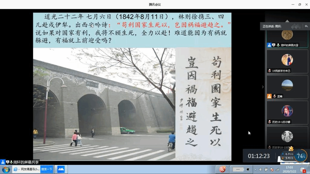 周轩教授是全国林则徐基金会学术顾问,《新疆文库》副主任兼编舞总监,四十年如一日潜心研究“林则徐在新疆”等一系列历史议题。林则徐是中国近代史上杰出的民族英雄,是中国和世界禁毒史上的一面旗帜。周轩教授详细讲解了鸦片战争背景下林则徐领导的禁烟和抗英斗争,指出林则徐虎门销烟激励了近代中国人民不屈不挠反抗外来侵略,是中华民族宝贵的精神财富。周轩教授重点讲解了林则徐在被清廷流放期间对新疆做出的杰出贡献,包括身处逆境仍然坚定的报国志、远见卓识的新疆建设思想、具体在伊犁开垦和新疆勘地方面的作为,以及他的文学活动。周轩教授总结了林则徐的爱国主义精神和高尚的品格风范,提出要对林则徐所留下的极其珍贵的历史遗产加以重视,这是我们能够从中汲取经验和教训、智慧和力量的不竭的源泉。