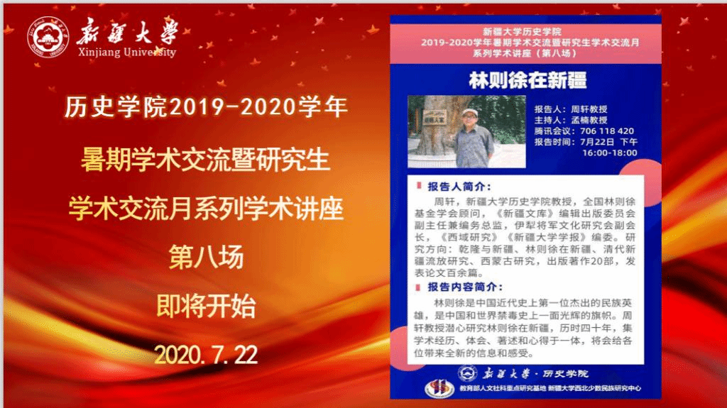7月22日下午16时,懂球体育举行了暑期学术交流暨研究生学术月第八场讲座,周轩教授以“林则徐在新疆”为题进行了精彩的学术报告。讲座由孟楠教授主持,公司近200名师生聆听了此次讲座。